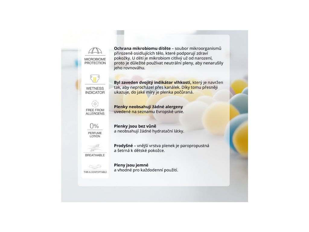 - Chrání mikrobiom pokožky: Mikrobiom je komplex mikroorganismů obývajících lidské tělo. Hraje mimořádně důležitou roli, např. při podpoře správného fungování kožní bariéry. Aby nedošlo k narušení rovnováhy mikrobiomu pokožky dítěte, měla by k němu být plena neutrální. A přesně taková je plenka Happy.