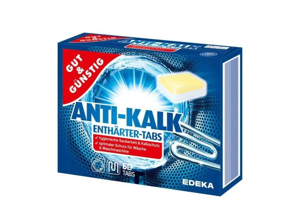 G&G odvápňovač do praček Anti-Kalk - 60 TABLET. Dokonalý odvápňovač v prášku s formulí chránící barvy tkanin. Produkt účinně změkčuje vodu a brání usazování se kamene ve tvé pračce. Díky zdokonalené receptuře, aktivní granulky prášku fungují již při teplotě 30 stupňů. Pravidelné používání odvápňovače G&G zmenšuje spotřebu pracího prášku a umožňuje více efektivní praní.Dovezeno z Německa.G&G Odvápňovací tablety do pračky 51ksVarováníZpůsobuje vážné podráždění očí. Je-li nutná lékařská pomoc, mějte po ruce obal nebo štítek výrobku. Uchovávejte mimo dosah dětí. Po manipulaci důkladně omyjte ruce a zasažené části těla. Používejte ochranné brýle. PŘI ZASAŽENÍ OČÍ: Několik minut opatrně vyplachujte vodou. Vyjměte kontaktní čočky, jsou-li nasazeny a pokud je lze vyjmout snadno. Pokračujte ve vyplachování. Přetrvává-li podráždění očí: Vyhledejte lékařskou pomoc/ošetření.5-