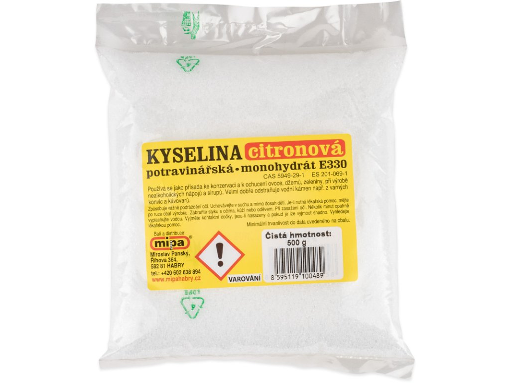 Kyselina citronová potravinářská 500 g. Používá se jako přísada ke konzervaci a k ochucení ovoce, džemů, zeleniny, nápojů a sirupů. Velmi dobře odstraňuje vodní kámen v kávovarech, konvicích. Uchovávejte v suchu a chladu.